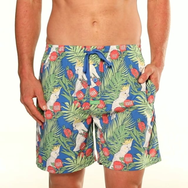 Bring the tropics to your top drawer with these Mitchdowd Men’s Sleep Shorts featuring an all-over print of white cockatoos and native bottlebrush on a bright blue base. Bursting with colour and character, they’re made for those who like their comfort with a bit of flair.