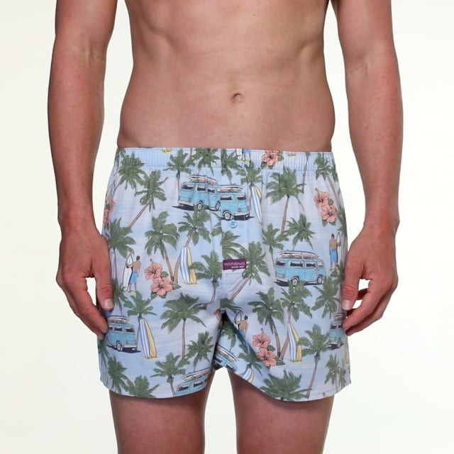 Add a wave of fun to your everyday essentials with the Mitchdowd Men’s Surfboard Van 3 Pack Cotton boxers shorts. This pack includes three unique designs: a retro surf van and palm print, a bold surfboard all-over print, and a timeless yarn-dye stripe. Crafted from soft woven cotton, these boxers deliver breathable comfort with a relaxed fit - perfect for all-day wear or lounging at home.