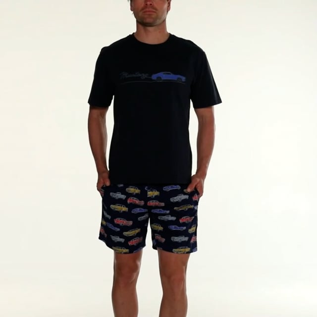 Drive into comfort with the Mitchdowd Ford Mustang Men's Pyjama Set, perfect for lounging or sleeping in style. Featuring a soft navy cotton t-shirt with a subtle Mustang car graphic and matching printed shorts showcasing vibrant classic Mustang cars, this set is designed for fans of timeless automotive style. Crafted from breathable cotton, the lightweight fabric ensures all-night comfort and ease of movement. The relaxed fit and elastic waistband on the shorts make it easy to unwind after a long day. Whether you’re a car enthusiast or simply love comfortable sleepwear, this pyjama set combines fun design with superior comfort.